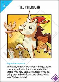- C&C Print Second Edition: When another player tries to bring a Baby Unicorn card from the Nursery into their Stable, you may DISCARD a card, then bring that Baby Unicorn card into your Stable instead.