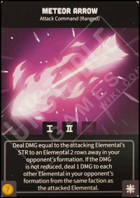 • Command of Nature KSE Extras: Deal DMG equal to the attacking Elemental's STR to an Elemental 2 rows away in yoru opponent's formation. If the DMG is not reduced, deal 1 DMG to each other Elemental in your opponent's formation from the same faction as the attacked Elemental.