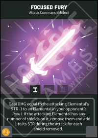 *'''Command of Nature Base Deck</u>:''' Deal DMG equal to the attacking Elemental's STR -1 to an Elemental in your opponent's Row I. If the attacking Elemental has any number of shields on it, remove them and add 1 to its STR during the attack for each shield removed.