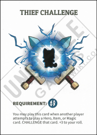 You may play this card when another player attempts to play a Hero, Item, or Magic card. CHALLENGE that card. +3 to your roll.