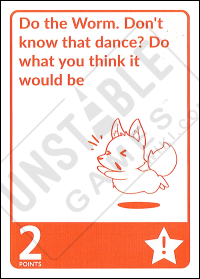 The Dare: Do the Worm. Don't know that dance? Do what you think it would be Point Value: 2 Challengable?: Yes *August 2018 Kickstarter - Quantity of card: 1