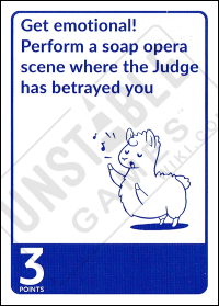 The Dare: Get emotional! Perform a soap opera scene where the Judge has betrayed you Point Value: 1 Challengable?: No *August 2018 Kickstarter - Quantity of card: 1