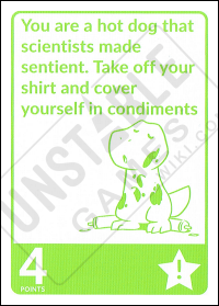 The Dare: You are a hot dog that scientists made sentient. Take off your shirt and cover yourself in condiments Point Value: 4 Challengable?: Yes *August 2018 Kickstarter - Quantity of card: 1