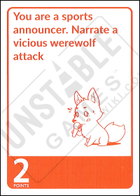 The Dare: You are a sports announcer. Narrate a vicious werewolf attack Point Value: 2 Challengable?: No *August 2018 Kickstarter - Quantity of card: 1