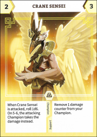 Champion Ability: When Crane Sensei is attacked, roll 1d6. On 5-6, the attacking Champion takes the damage instead.