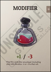 - KS Print n Play Edition/Base Deck/2nd Edition Base: Play this card after any player (including you) rolls the dice. +1 or -3 to that roll.