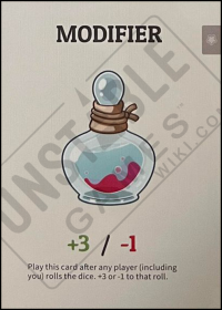 - KS Print n Play Edition/Base Deck/2nd Edition Base: Play this card after any player (including you) rolls the dice. +3 or -1 to that roll.