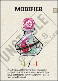 • Banner Quest Expansion: Play this card after any player (including you) rolls the dice. +1 or -1 to that roll. If you have a Necromancer in your Party, +3 or -3 to that roll instead.
