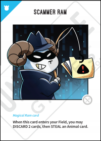 Original Text: When this card enters your Field, you may DISCARD 2 cards, then STEAL an Animal card.