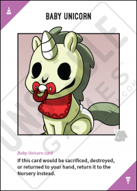 - If a Baby Unicorn Card would be moved to a player's hand, the Discard Pile, or the Deck it is returned to the Nursery instead.