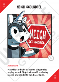 - Can I use a Neigh card to stop someone from triggering a Unicorn card's effect? Once a card is in someone's Stable, a Neigh card cannot stop them if they choose to trigger the card's effect. NEIGH can be played to stop any Player's action phase card or any Instant card.
