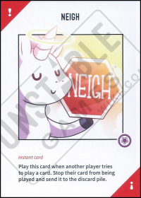 • Can I use a Neigh card to stop someone from triggering a Unicorn card's effect? Once a card is in someone's Stable, a Neigh card cannot stop them if they choose to trigger the card's effect. NEIGH can be played to stop any Player's action phase card or any Instant card.
