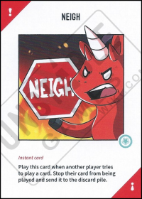 • Can I use a Neigh card to stop someone from triggering a Unicorn card's effect? Once a card is in someone's Stable, a Neigh card cannot stop them if they choose to trigger the card's effect. NEIGH can be played to stop any Player's action phase card or any Instant card.