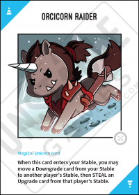 - 2nd Edition: When this card enters your Stable, you may move a Downgrade card from your Stable to another player's Stable, then STEAL an Upgrade card from that player's Stable.