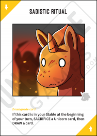 - Original Text: If this card is in your Stable at the beginning of your turn, SACRIFICE a Unicorn, then DRAW an extra card.