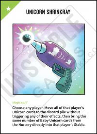 Wybierz dowolnego gracza. Przenieś wszystkie jego karty jednorożców na stos kart odrzuconych, nie aktywująz żadnego z ich efektów, a następnie umieść taką samą liczbę kart jednorożków ze żłobka bezpośrednio w jego stajni.